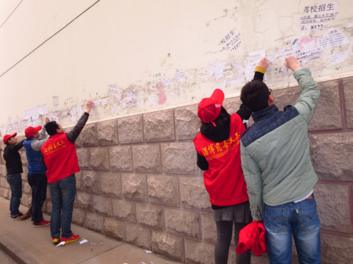 在活动开展前,由公司慈善义工总队负责,结合小广告不规范,不文明张贴情况已展开调查,为活动的顺利完成做好充分准备。小广告集中地较多的是分布在宿舍楼墙面,所有人被分成9组,主要分别清理各餐厅跟宿舍楼墙面。分配好任务,各小组长有序地带领各小组拿好工具,到达指定地点进行工作。期间,矿物加工1201团支部的同学热情高涨,积极认真,并高效率、高质量