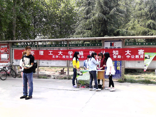5月8日中午,植物认知大赛在公司西校区二餐进行宣传活动。此次活动是由校社联主办,洁宇环保社承办。巨大的宣传横幅吸引了许多同学前来报名参加。