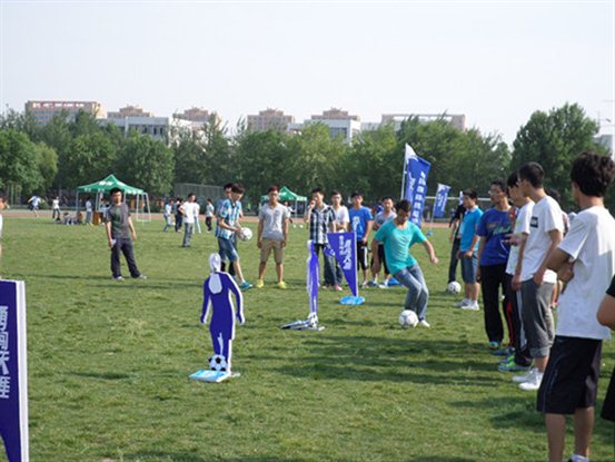 据了解,本次趣味足球赛分为四个模块,分别为巨星风采展示、任意球大师、盲人足球及海底捞月。巨星风采展示包括颠球模块和盘带技巧模块,颠球模块以参赛者比赛中颠球数目为评判标准,参赛者积极投入其中,炫酷的球技令在场观众赞叹不已;盘带技巧模块要求参赛者从障碍杆两侧带球射门,参赛者纷纷拿出最好状态,各展风采;任意球大师模块要求参赛者于指定位置踢任意球,选手或一脚临门抽射,或选取最佳角度,奋起破门。现场激情四射,好不热闹;盲人足球模块主要考查队员间的默契程度,参赛队员配合传接,在绿茵赛场上尽显心有灵犀的功力,在场观众无不叹服;比赛最后一个环节,海底捞月模块要求参赛队员站成一排进行传球,讲求脚法与速度,准确性与默契程度,现场观众的掌声不绝于耳。