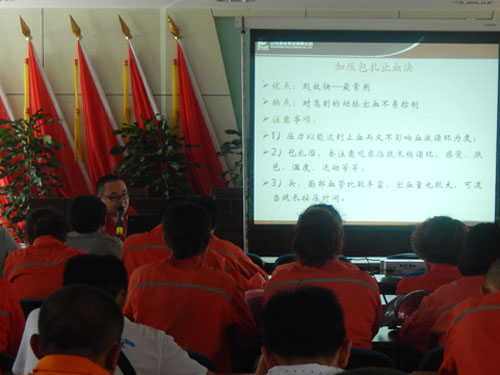 矿企安全问题是矿业生产顺利进行的保障。公司安全环保部负责人通过ppt讲解向员工清楚讲解相关安全自我保护方法。防范于未然是最大避免伤害的根本方法,他以矿厂伤亡现实为例,分别向在座观众传达自我保护的重要性。他以意外流血为例系统的为大家带来止血有效方法,比如直接压迫止血法、加压包扎止血法、背压止血法、加垫屈肢止血法等。同时,他通过肢体动作表示更加明确形象地向大家说明各种止血方法的步骤。“资环梦 矿山行”实践团队员也受益匪浅。