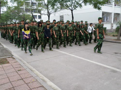 放眼望去,一片迷彩装扮,十分耀眼。可是天气跟他们开了个“玩笑”,下起了淅淅沥沥的小雨。有的在那站军姿,雨水打在他们的帽檐上、打在他们的身上,可军训中的人们完全不受其干扰;有的在教官的带领下,伴着阅兵曲的节奏,迈着整齐的步伐,喊着响亮的口号,一遍又一遍的来回训练;有的即使训练累了也是整齐的坐在各自的马扎上,完全没有丝毫松散的样子,举止间显露出新一代老员工的模样。