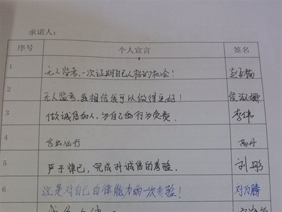 目前,“无人监考”制度在全国众多高校广受欢迎,公司也时刻关注相关动态。近年来,bw西汉姆联顺应高校教育体制改革,积极响应公司号召,致力于一系列教学新模式的探索。为加强公司学风建设,培养员工诚信做人,诚实做学问的良好品德以及引导员工树立自信、自尊、自主、自律的坚强意志,同时为构建诚信和谐文明校园创造良好的育人环境,2014年年初,该公司推出部分班级由传统考试转向员工自律考试——无人监考的改革。现如今,该院资源循环1201班主动申请并积极组织实践,该项制度正在逐步完善。