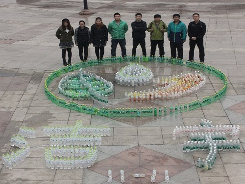 在结束仪式上,秉承着社团的宗旨,洁宇环保社与青春在线网站的成员们在老员工艺术广场的地面上,用之前共同收集的“漂流瓶”,一起摆放出“青春在线”与“洁宇”的字样,并且摆出了自己社团与自己网站的logo。虽然天空阴沉着自己美丽的脸颊,但是洁宇环保社与青春在线网站的骨干们仍然各司其职,有序的摆放着“漂流瓶”。经过了一个小时的奋战,老员工艺术广场的地面上多了一抹美丽的风景。