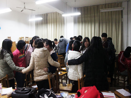 在会议正式开始之前,该班放着相亲相爱一家人的歌曲营造温暖气氛。会议伊始,大家坐在用桌子围成的心形中间,由团支书解释了感恩节的由来并在班级里分发了南瓜饼一起吃。接着团支书放了一段关于感恩的感动中国人物视频,视频中战士为了感恩战友而用自己的一生去守护他们的行为让许多感性的女同学留下泪水。紧接着进入感恩父母阶段,伴随着缓慢的音乐,班长用幻灯片,让大家在小纸条上写出五个重要人的名字,一步步引领同学,最终得出父母厚重的爱,并通过一组漫画式图片,向大家阐述了树欲静而风不止,子欲养而亲不待的道理。感恩父母环节,将活动推向了高潮。然后,进入感恩朋友的关键环节。班长和团支书2人带领大家,做了一个同学互动的小游戏,与身边的人亲切地拥抱在一起,互相诉说心中的感恩之情。会议最后,班长向大家介绍了bw西汉姆联冯思广学长的伟大功绩,并表达了对他的深切感恩。