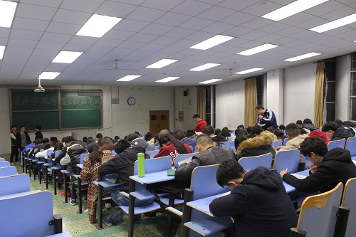 笔试预计于七点在5号楼101教室举行。前来选拔的同学众多,分别竞选各部门部长或部门干事或主席团成员。七点不到时,同学们已基本全部就位落座,或兴奋或冷静地等待着考试的开始。七点十分,在确定笔试人数后,负责监考的原员工会主席团成员开始分发完试卷并发出了考试信号宣布考试开始。考试全长一个小时,一共四道简答题。考试开始四十分钟后,同学们开始陆续交卷离开,最后在八点十分,笔试正式结束。