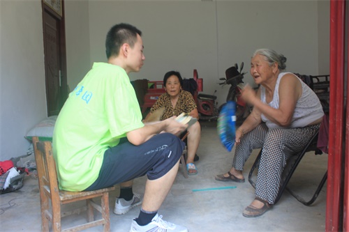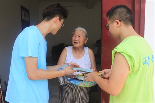 22日清晨,葛通一行人早早的起床洗漱。他们今天的任务是到曹庄村的一位老人家里,陪老人聊天、做杂务,给老人送去温暖。在前几日的曹庄村村委党员会议,团队成员了解到了该村诸多老人,他们子女大多在外务工,家里只有老人和留守儿童,部分家庭虽然家庭条件不是很差,但老人缺乏关怀,孩子缺乏照顾的现象相当普遍。在得知这一情况后,青年团一行人经过仔细认真研究讨论后,制定了几个方案和实施措施。临近中午,他们赶到老人家中,帮助老人扫地、打水、擦窗户,并和老人聊天拉呱。在了解到该家庭中有两位上中学的孩子后,队员们将准备好的书籍送给了老人,让他转交给孩子。活动结束后,老人拿出西瓜招待前来献爱心的队员们。