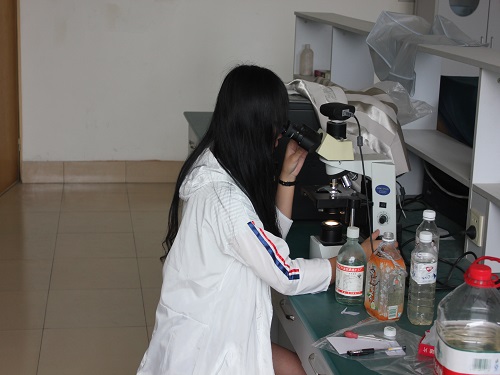 在检测开始之前,实践队员们首先将储存在恒温生化培养箱中的水样取出,并在每瓶水样中取出一部分作为此次检测的样本。取样结束后,实验总负责人辛富森从环境工程仪器储存室中取来高倍率光学显微镜,载玻片,盖玻片,浓盐酸。检测过程的第一步是涂制临时装片,此过程要接触有较强腐蚀性的浓盐酸,所以实验总负责人辛富森要求负责装片涂制的李亚佩戴橡胶手套加以防护。在装片涂制完成以后,实践队员们先采用低倍镜观察,统计出水样中的微生物种类,再采用高倍镜进行观察,主要观察水样中微生物的具体形态。最后的统计数据显示,马踏湖国家湿地公园的水样中共有微生物四类,七种,水质状况较好。