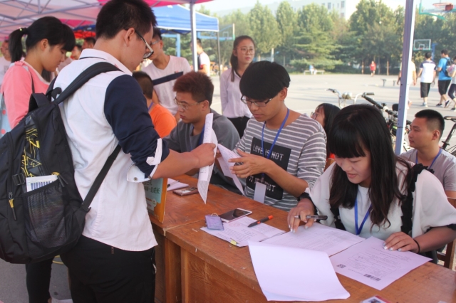 随着新生报到工作的有序开展,志愿者们的工作也渐渐地进入了常态化:新生身份验证、介绍并发放新生入学的有关材料、带领新生办理入住手续,一环接着一环的有序的进行着。