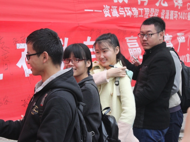 阴郁的天气挡不住同学热忱的心,上午10时30分许开始。资循环1401班的八个学习小组分别组织进行小组的签名仪式,他们以五位同学作为一个小组,记者观察到,每个小组的“签字风格”都有所不同,“大家都有一个共同的愿望,顺利完成这次与众不同的的考试,来充分展示自己的一次考试。”班级负责人之一说到。