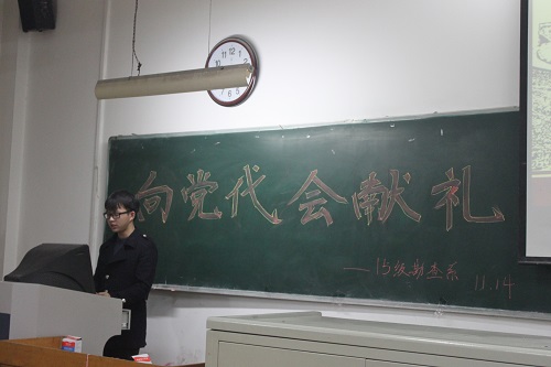 活动在庄严的国歌中开幕,伴随着国歌声活动开始,勘查1503班团支书韩永简单地向大家介绍了党代会的含义和内容。接着,他谈到习近平总书记在党代会上的讲话,他说道要坚持党的领导,拥护和支持中国共产党。然后,他向大家介绍了淄博市的红色纪念馆,例如黑铁山纪念馆,淄博市革命烈士陵园,让同学们印象深刻。最后他向大家介绍了淄博区的抗战英雄刘庆棠,马耀南等,他说这些抗战英雄为了我们的和平而浴血奋战,我们应该铭记历史,永怀先烈。