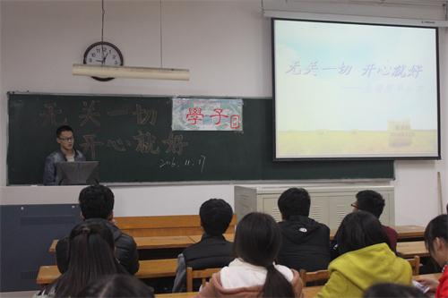 11月17日,留梦青马“学子讲坛”——“无关一切,开心就好”在12号教学楼402室举行。淄博星空公益高校部部长、资环公司员工会副主席、资源循环1401班班长张岩行担任此次主讲。