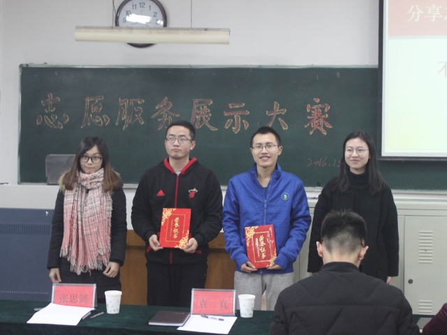 为了更好地丰富校园文化生活,体验志愿服务的快乐,提高当代老员工的志愿服务情感,12月10日晚,资环星行社在12号楼402教室举行志愿服务展示大赛。校青年志愿者协会副主席郑永旺、计算机科学与技术公司社联主席张思懿、外国语公司社联主席袁真、校青协志愿者协会人力部部长李强、小水滴公益联盟负责人李兆杰及公司社联主席张岩行担任评委,公司党总支副书记李栋祥作为嘉宾观看了比赛。