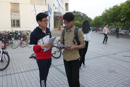 在此次活动的前期准备工作中,各成员既明确分工又相互协助,协同完成各项准备工作。此次宣传工作于4月20日下午开始,宣传人员主要是在各餐厅门口发放宣传单页,同时也向同学们说明参与此次活动的重要意义和价值,让同学们充分了解活动的性质以及开展形式,鼓励同学们积极主动的报名,在娱乐活动中提升自我、发展自我。