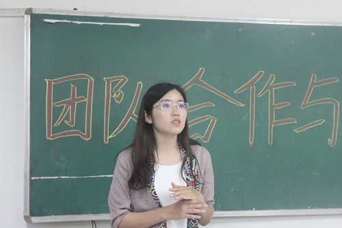 团课伊始,苗涛以做拍拍操的方式,引入团课的主要内容,同学们在做操过程中慢慢意识到了团队合作的重要性。随后,她为同学们详细解说团队的定义,她说,团队应该是心理上相互信任,技能上相互补充,行为上相互影响,利益上相互依存,为了达到共同的目标,而结合在一起的人群集合体。她指出,团队协作包括服从、信任和合作。与此同时,为让同学们更为深刻的理解团队合作的重要性,她让各个小组分别画了一幅画,并将画撕成12份后与其他组交换,考验哪组成员能够在规定时间内将撕成碎片的图画重新拼出来。在这个过程中,各个小组内分工明确,组员们各尽其职。她说,通过拼图,希望骨干们能联系日常工作,清楚自己在团队中适合扮演什么样的角色,担任什么样的职务。最后,她向各位同学们介绍了沟通的重要性以及一些日常沟通技巧,她强调,在座的各位员工干部们要注意向上、向下沟通的方式方法,不同的说话方式可能会产生不同的效果,要改进自己的说话方式,提高与人交流、交往的能力。