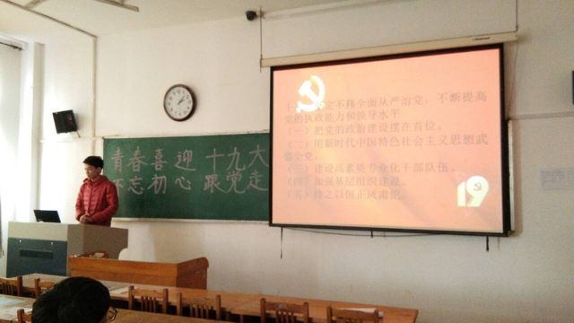 “青春喜迎十九大,不忘初心跟党走”。10月19日下午,在12号教学楼410教室公司组织员工党员观看了十九大开幕式。参加此次活动的有公司各专业员工党员,矿物加工工程1402班王玉斌担任此次活动的主持人。