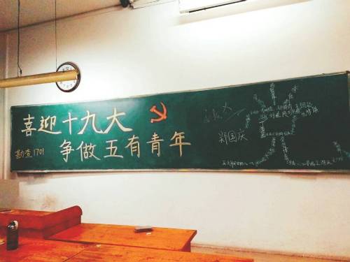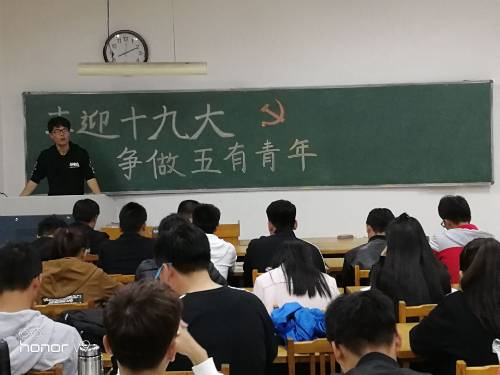 活动伊始,姜振鑫首先对活动内容和目的做出简要阐述。活动首先是全体同学观看十九大视频,视频主要截取了习近平总书记的讲话部分,每位同学都以严肃认真的态度观看。随后,姜振鑫组织同学们交流讨论并谈谈对党的十九大的感想,以宿舍为单位各选一个代表上台发言。同学们都积极参与到活动中来,纷纷表达对党的十九大的看法和认识。接着,姜振鑫组织同学们交流关于如何争做五有青年的想法,同学们首先对五有青年进行了解释,五有青年即有社会责任感、有创新精神、有专门知识、有实践能力、有健康身心的新一代社会主义高级应用型人才,然后同学们就如何成为五有青年展开了激烈讨论,不少同学上台阐述自己及小组内的看法,在坐的同学都感触颇深,掌声不断。最后,陈明翠组织全体同学在黑板签名形成“党”字,意味着我班同学跟着中国共产党走的坚定信念,更加突出此次团日活动主题、彰显活动意义。