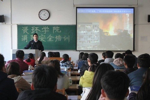 讲座开始前,李栋祥表示,秋冬季节气候干燥,一旦发生火灾,便会很快蔓延,因此做好消防工作显得格外重要。讲座伊始,王浩以图片和视频的方式通过国内高校一个个血淋淋的真实案例让大家深刻感受到掌握消防知识的必要性。他提出问题:大家发生火灾时该怎么做?幽默风趣的语言风格使得现场互动频繁,王浩结合大家的答案对发生火灾时如何逃生的错误方式进行了纠正。随后,他借新闻里的真实报道及视频影像还原事故,追根溯源,向大家说明生活中的大型火灾事故一般都是我们忽略了现实中的小隐患。接着,他对如何预防消防事故的发生深入浅出地讲解了消防安全知识,同时着重说明了消防器材的使用步骤,不仅从理论上向大家传授各种消防安全知识,还亲自进行现场演示。同学们都认真观看并做了详细笔记。最后,王浩让大家就生活中如何更好的做到消防安全进行提问,对于大家存有的疑惑,一一给出了详细的解释,他表示,火并不可怕,可怕的是消防安全观念的缺失,要从真正内心重视消防,才能更好的保障生命财产安全。