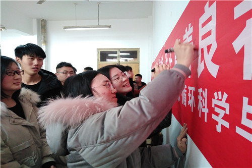 马玉文则讲述了自己一年来的工作体会和与同学们相处的种种感触,并对考核方式中的各项内容所占成绩比重作了详细说明。随后,赵鹏向大家阐述了无人监考成功实施的巨大意义与优良学风班级建设的重大作用。赵鹏讲到,无人监考和优良学风班级建设是公司学风建设的重要工作,无人监考作为学风建设的重要内容,不仅仅是一种形式,更是一种结果,一种正能量,是对同学们优秀品质的肯定。他祝愿同学们扛起诚信考试的大旗,为资环学子树立榜样。