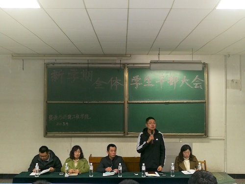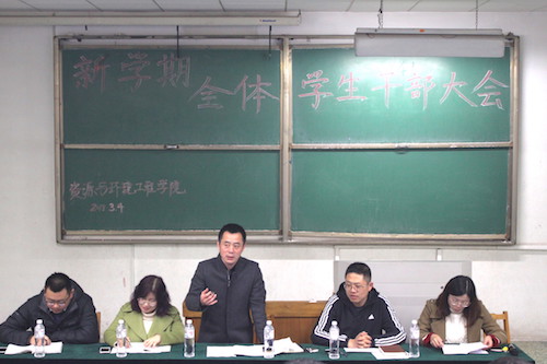 3月4日下午,公司在5号教学楼105教室召开新学期员工干部大会,参与此次会议的有公司党总支副书记李栋祥,团总支书记赵鹏,教学科科长于文刚,团总支老师张倩、苗涛以及各班班长、团支书、学习委员、党员及宿舍长代表。此次会议由赵鹏主持。