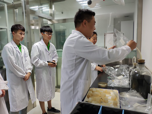 早上8点,团队成员准时到达山东省环境监测中心站,王绪刚接待了团队一行人。他向团队成员简单介绍了此次嗅辨检测的主要流程:上午外出进行实地取样,下午进入实验室配气并进行嗅辨操作,最后公式计算检测结果。取样前,王绪刚告知大家须将三个取样瓶内置于真空状态,外出取样时应将瓶口向上倾斜45°方向,并简单介绍了取样过程中的一些注意事项等,随后,他带领大家一起去器材室准备相应的仪器设备。天公不作美,在团队外出取样前,室外下起了小雨,为了不影响取样样品的相关浓度等性质,王绪刚带领大家到附近的炼油厂进行就近取样。到达炼油厂后,为了让团队成员切身体验取样过程,王绪刚将取样仪器交给实践团队成员,并监督、指导成员操作,保证取样准确有效,取样过程中,团队成员实时记录取样点的风向、温度及湿度信息。取样完成后,大家一起回到环境监测中心恶臭实验室,并于下午进行样品的前期处理及嗅辨检测工作。