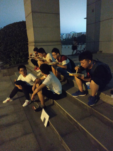 图2——第一天地质技能综合应用比赛时间是27号9:30到20:30共11个小时,其中午餐和晚餐是在比赛场地内解决,参赛选手为了更好地完成作品,比赛期间没来得及吃晚饭,等结束后才在参赛教室外的阶梯上匆匆吃完了盒饭……