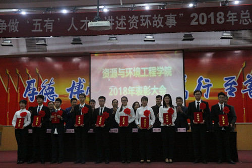 表彰大会第二篇章是讲述资环故事,传播资环能量。各类获奖员工代表分享了他们在班级建设、科创比赛、学习竞赛、社会实践、文体心理等方面的成长故事,故事饱含爱的源头、心之所向的集体责任,不在能知、乃在能行的创新精神,敏于求知、孜孜不倦的学习初心,行得真知、心唯大我的社会实践,拥抱生活、滋润心灵的健康身心,体现了资环学子立志争做“五有”人才的良好精神面貌。