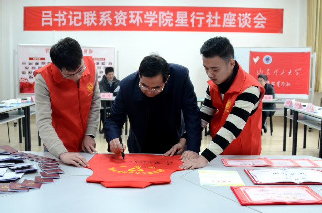 座谈会上,应社团成员邀请,吕传毅现场书写“千里之行、始于足下”八个字寄语勉励员工。