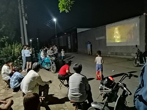 活动开始前,实践团成员按照安排清点实践物资,在确认设备完备后对播放设备进行调试,寻找合适的播放电影的广场,并在将要播放电影的广场上拉好隔离带,座位摆放整齐。准备就绪后实践团队员前往村中广播站向村民传达播放电影的通知,并提醒他们带好口罩。夜幕降临后,活动正式开始。实践团放映的第一部电影是《闪闪的红星》,这部电影讲述在艰难困苦的环境中成长起来的少年英雄的故事。电影时长为100分钟,在观看过程中村民们都格外认真,感悟了爱国英雄的艰辛历程。电影结束后,团队人员和村民们合影留念。