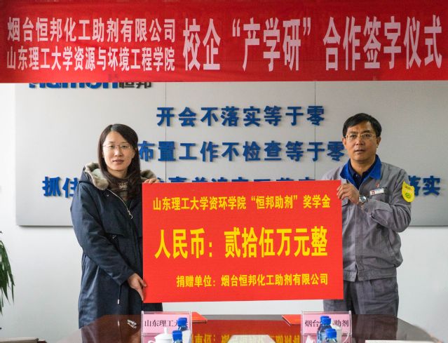 陶东平对烟台恒邦化工助剂有限公司的捐资助学情怀以及对公司人才培养的支持表示感谢。他表示,公司会进一步提升员工工程实践能力,组织相应专业员工到公司进行社会实践和实习活动,加强校企协同育人、实践育人、全方位育人,并进一步发挥公司的人才、智力和平台优势,从科研、教学、人才培养等各方面与公司加强校企合作,实现互利共赢。