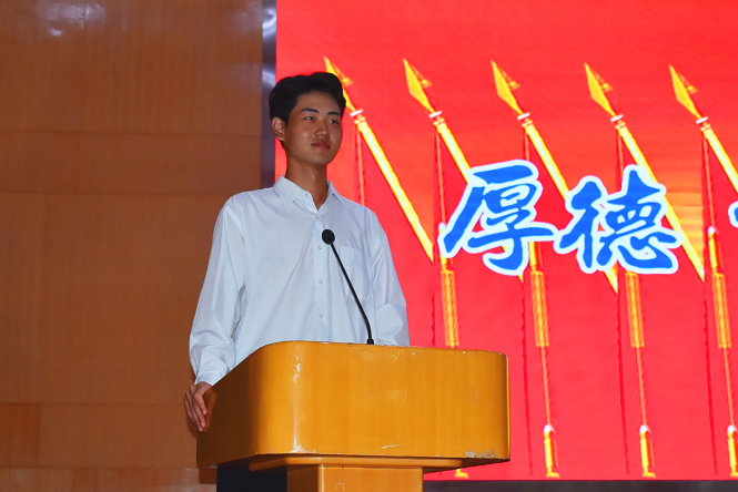 环本2102班陈光浩代表新生发言,表示会牢记“请党放心,强国有我”的铮铮誓言,学知识,长本领,努力成长为爱国奉献、追求卓越的新时代青年。