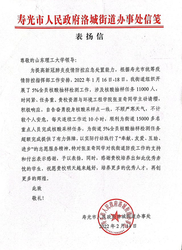 3月,一封来自寿光市人民政府洛城街道办事处的表扬信来到bw西汉姆联,表扬bw西汉姆联2020级本科生张亚奇同学在疫情防控期间的奉献。