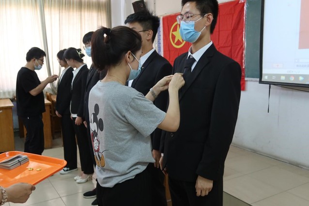 入团仪式在嘹亮的国歌中拉开序幕。仪式上,参会老师为新团员佩戴团徽,颁发团员证、共青团徽章。