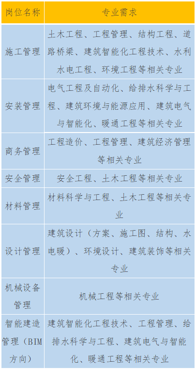 需求专业为:土木工程、工程管理、建筑电气与智能化、电气工程及自动化、建筑环境与能源应用、给排水科学与工程、管理科学与工程、工程造价、会计学、财务管理