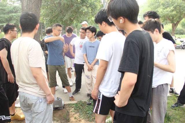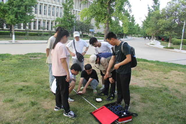 王瑞兴、李佩结合多年野外工作经验围绕多种物探方法、仪器设备操作、数据采集流程等内容进行详细讲解,通过相关数据反演公司图书馆南侧草坪第四系厚度,验证了地球物理设备在现场实例应用中的可靠性。在实践过程中,两位高级工程师鼓励同学们积极投身地质矿产勘查行业,为国家矿产资源及能源安全保障贡献自己的力量。