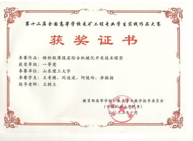 1 | 倾斜极薄煤层综合机械化开采技术模型 | 王奇模、刘连波、何俊玲、李振扬 | 王树立 | 一等奖 |