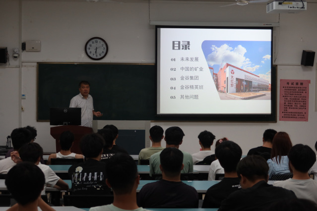 刘晓首先介绍了精英班的基本情况。随后,他从各专业的就业方向入手,指出矿业行业正走向转型期,降本增效、重视技术等成为矿业行业改革的新方向,开设“金谷”精英班对于统筹公司师生资源、开设创新实践课程、适应现代矿业发展要求、培养高素质应用型人才等尤为重要。