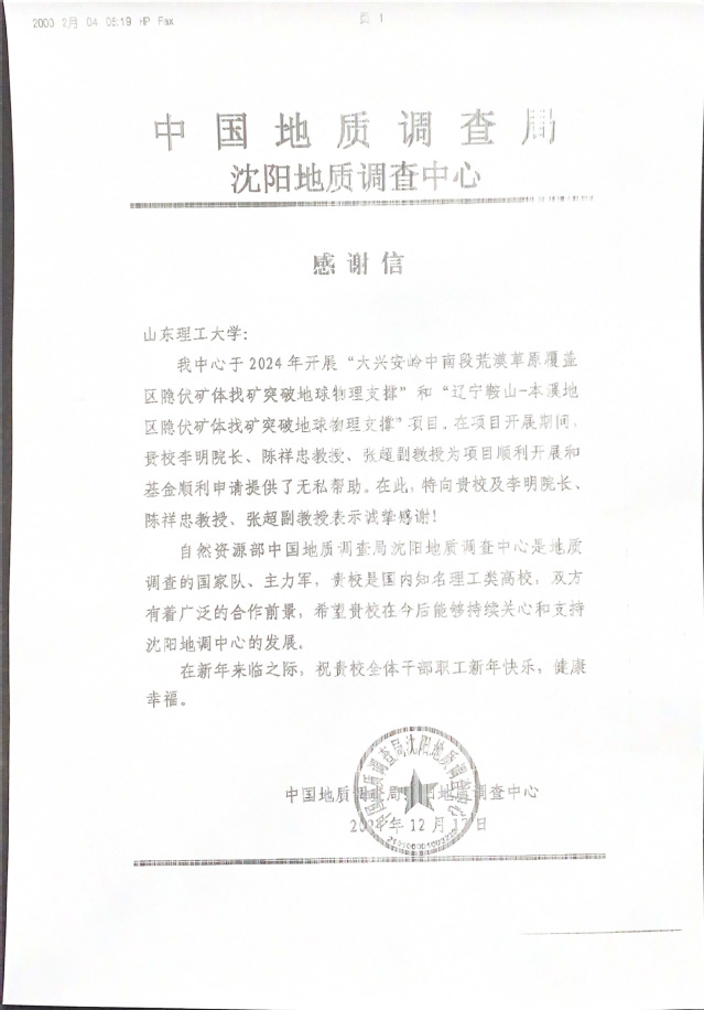 自然资源部中国地质调查局沈阳地质调查中心向公司发来感谢信