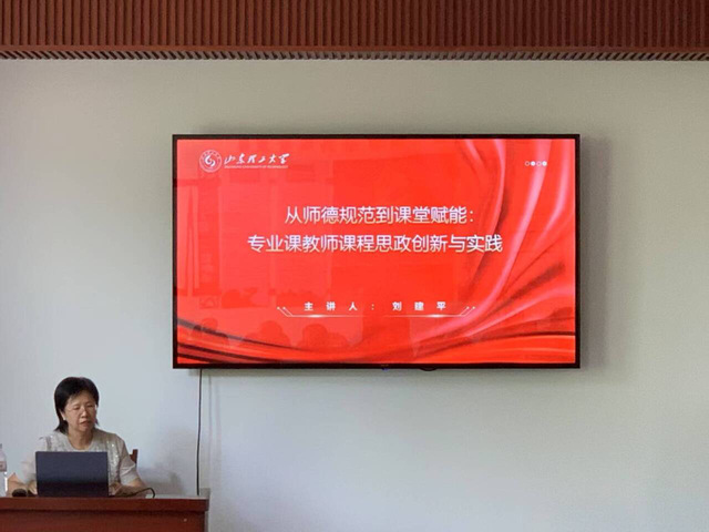 报告会上,刘教授结合二十余年的教学经验,以《高等公司课程思政建设指导纲要》等文件政策要求为切入点,围绕“融什么、怎么融”的课程思政建设主线,详细讲解了以“双线融促”课程建设理念完善“四元素”思政教学设计的举措和方法,介绍了她在课程思政建设中的探索和成果,并通过典型案例分享她对研究生导师行为规范的认识,强调师德筑基,以教师人格魅力点燃员工价值火炬。