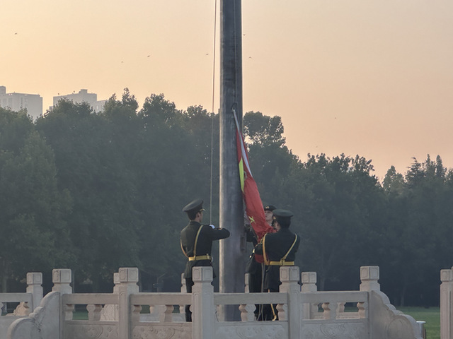 清晨6:30,英姿飒爽的国旗护卫队迈着铿锵有力的步伐,护送着鲜艳的五星红旗走向升旗台。在庄严的国歌声中,全体师生肃立行注目礼,注视着五星红旗冉冉升起,迎风飘扬,共同感受这一神圣而庄严的时刻。